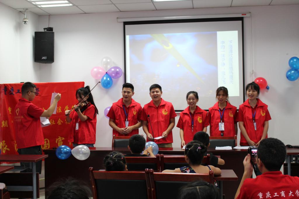 7月23日上午,英国365官方网站法学院2018年暑期“三下乡”社会实践依法治国宣讲团在九龙坡区石桥铺街道老顶坡社区开展了暑期嘉年华之“跟我学唱歌”。在悠扬的歌声当中,来自老顶坡社区的中小员工们和宣讲团成员们度过了愉快的课堂时光。